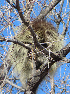 Porcupines are currently in a state of torpor as they wait out the cold weather. This one can be reliably found in a single grove of trees each day. Sometimes he is eating the fresh buds of this Siberian elm, but mostly, he snoozes.